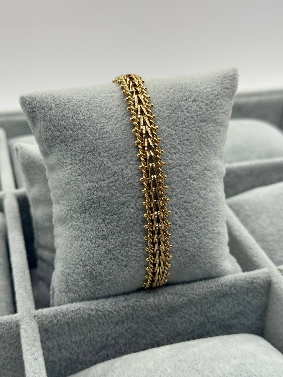 O brățară deosebită pentru femei, cu împletitură lată și detalii decorative pe margini. Ușoară și confortabilă la purtare, este accesoriul perfect atât pentru ținutele de zi, cât și pentru cele de ocazie. Designul versatil permite asortarea brățării cu orice bijuterii sau ceas, evidențiind feminitatea și rafinamentul.