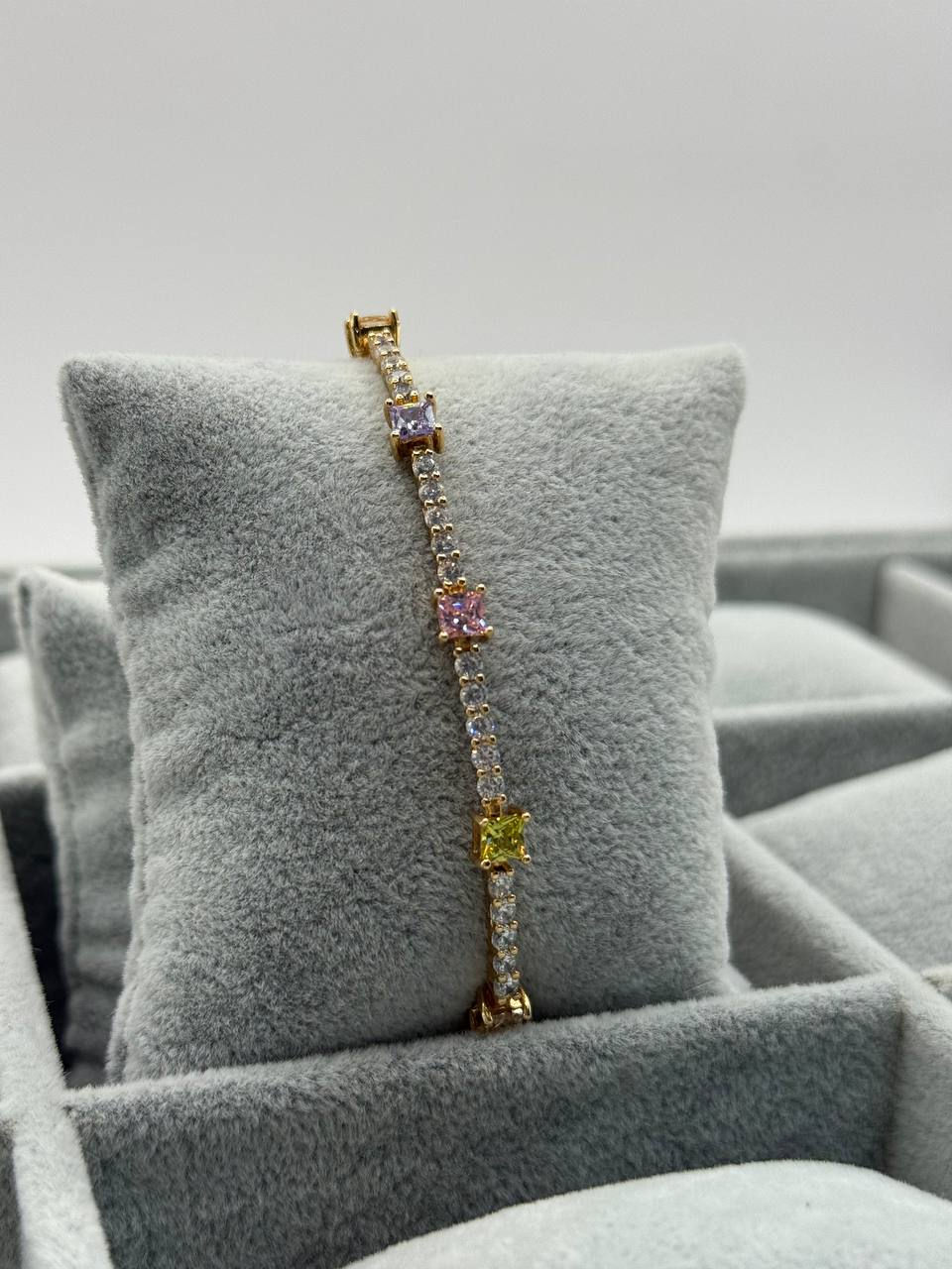 Brățară cu pietre multicolore și cristale – un accesoriu delicat și strălucitor, care adaugă un plus de originalitate și eleganță ținutei tale. Realizată din aliaj metalic rezistent, cu finisaj auriu, este decorată cu cristale transparente strălucitoare și trei inserții mari în nuanțe diferite: liliachiu, roz și galben. Ușoară, comodă și versatilă, această brățară completează perfect atât ținutele de seară, cât și pe cele de zi.