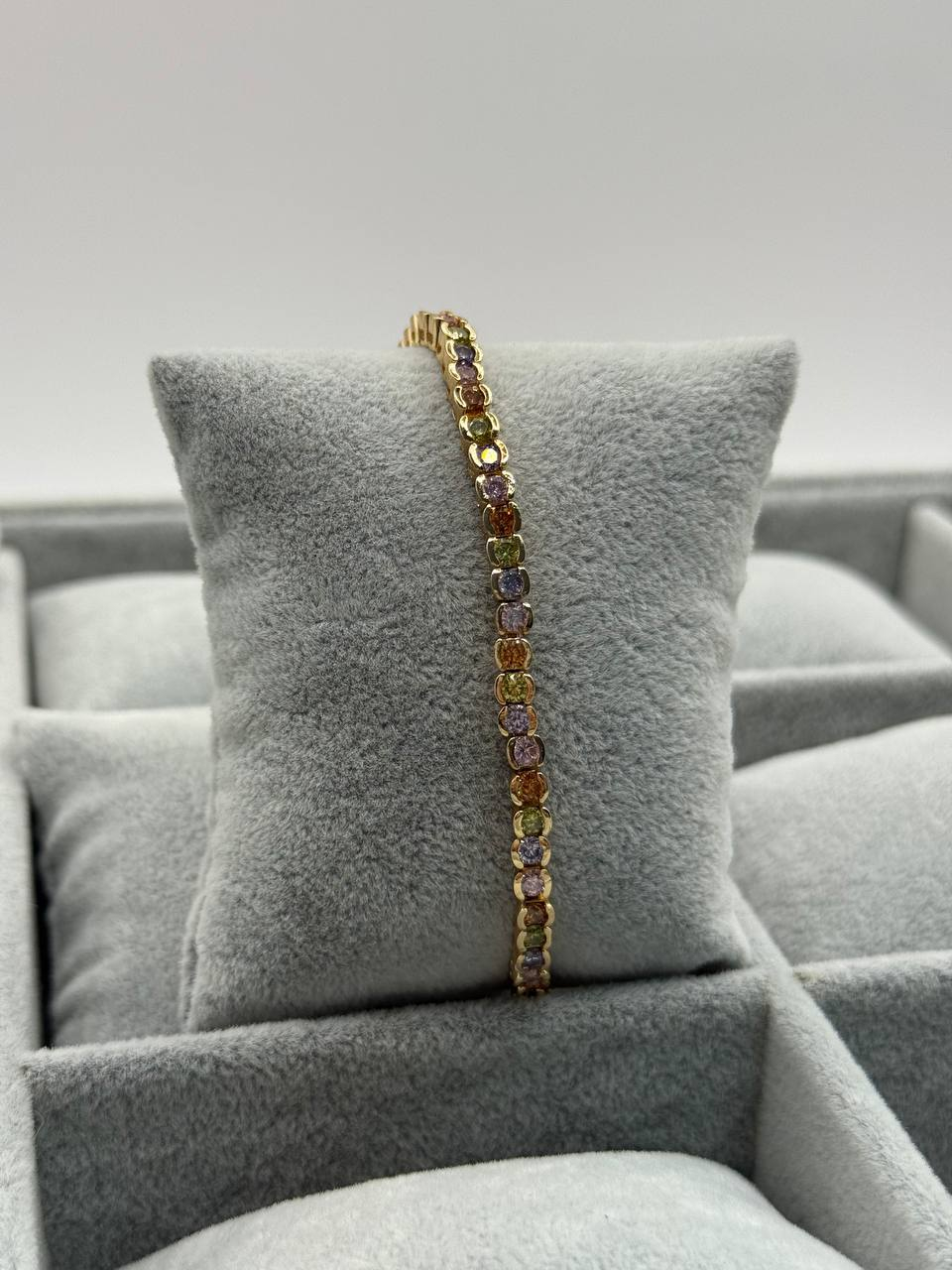 Brățară elegantă pentru femei, decorată cu zirconii strălucitoare în nuanțe delicate de roz, mov, verde și auriu. Metalul cu acoperire tip aur oferă un luciu rafinat, iar montura atent lucrată creează un joc frumos de culori. Ușoară și comodă, este perfectă atât pentru ținute de zi, cât și pentru evenimente speciale. Un cadou minunat pentru tine sau pentru cineva drag.