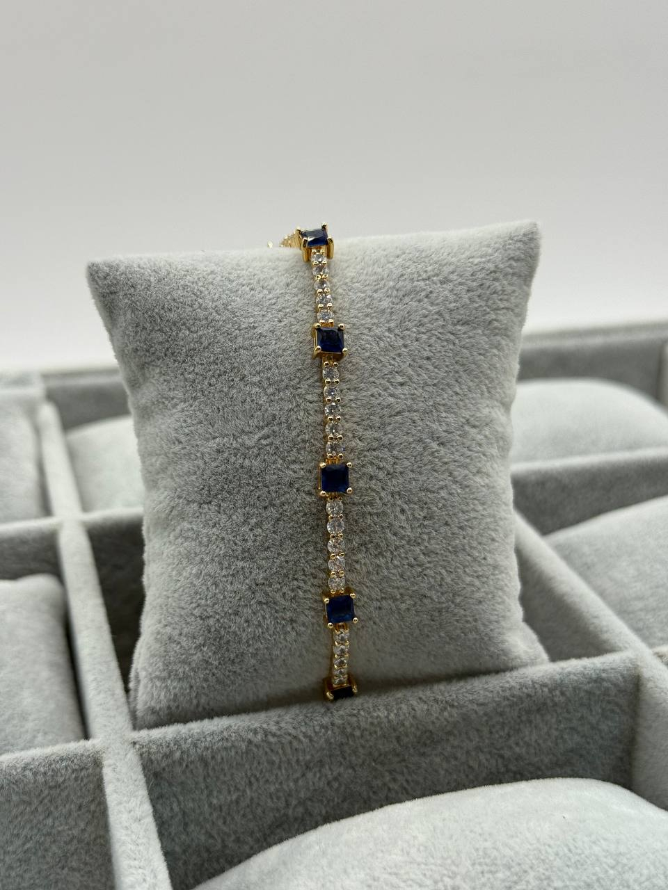 Brățară elegantă pentru femei, cu inserții alternante din zirconii de culoare albastru intens și pietre transparente. Metalul cu acoperire tip aur oferă un luciu rafinat, iar designul delicat o face perfectă pentru ținute de seară și ocazii speciale. Ușoară, comodă și versatilă — un cadou minunat pentru femeia iubită.