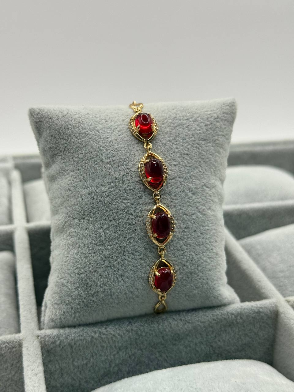 Brățară elegantă pentru femei, cu inserții ovale mari de culoare rubinie intensă. Pietrele sunt încadrate de zirconii mici, care adaugă un plus de strălucire. Metalul cu acoperire tip aur evidențiază frumusețea nuanței și oferă un aspect rafinat. Ideală pentru evenimente speciale, seri romantice sau ca accent deosebit în ținutele de zi. Un cadou minunat pentru o femeie.