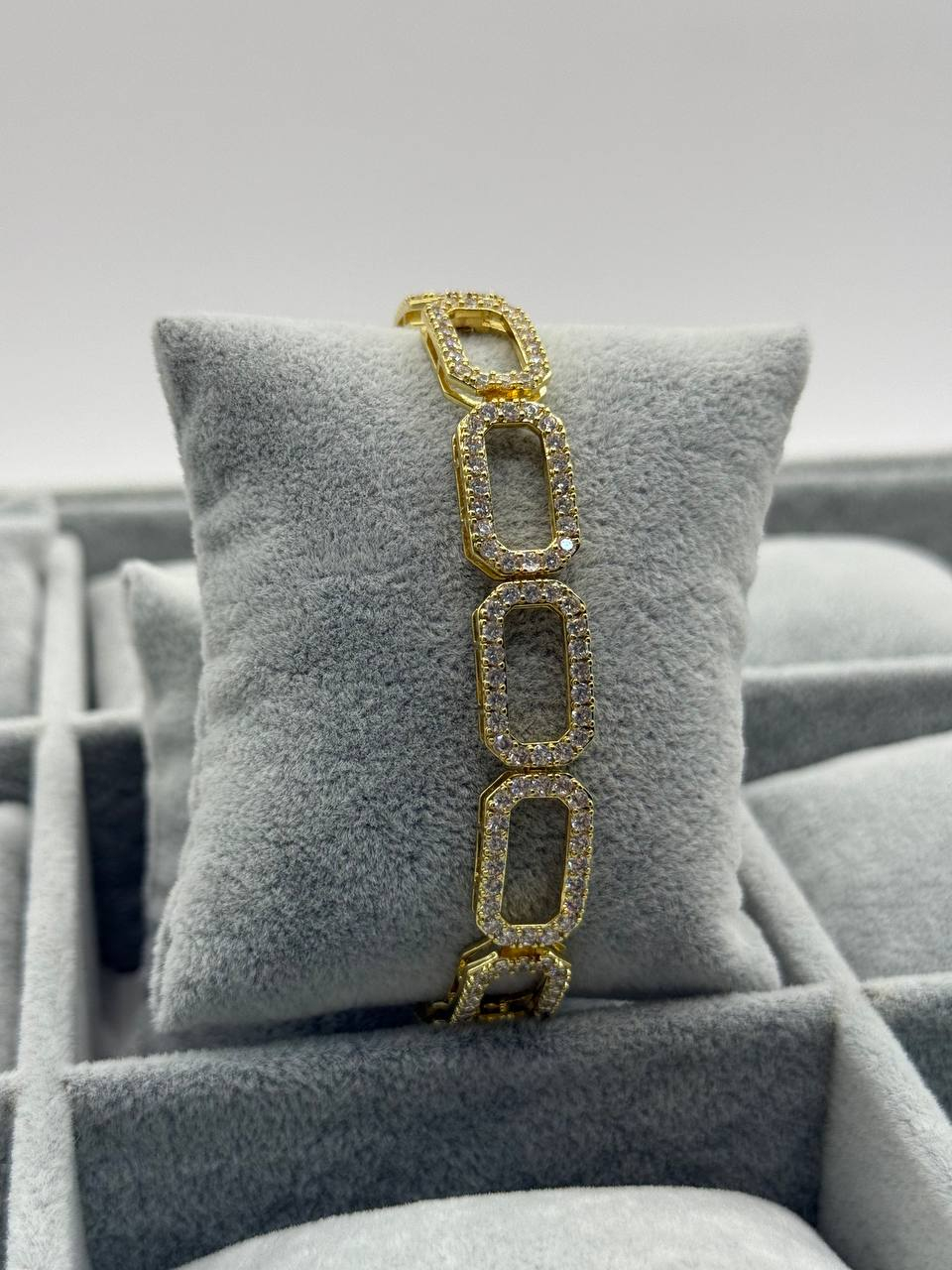 Brățară elegantă pentru femei, cu zale mari decorate cu pietricele strălucitoare. Nuanța aurie și strălucirea cristalelor oferă un aspect rafinat și luxos, ideal pentru ținutele de seară și ocaziile speciale.