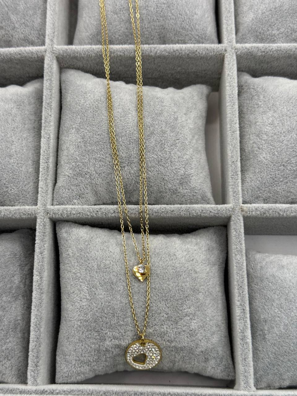 Colier dublu pentru femei din bijuterii de calitate. Realizat cu acoperire aurie, nu se înnegrește și își păstrează strălucirea în timp. Pe lanțul scurt se află un pandantiv în formă de inimă cu piatră, iar pe lanțul lung – un medalion rotund cu inimă decupată, decorat cu zirconii. Un accesoriu modern și romantic, care evidențiază feminitatea și se potrivește atât pentru ținutele de zi, cât și pentru ocazii speciale. O alegere excelentă de cadou pentru o fată sau o femeie.