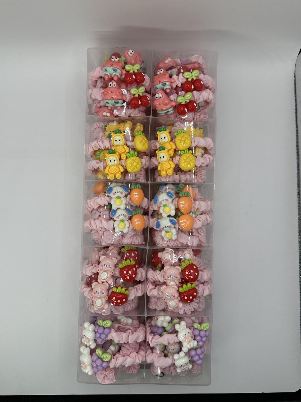 Elastic roz tip scrunchie, decorat cu personajul Patrick din „SpongeBob” și cireșe roșii lucioase. Un accesoriu vesel și original pentru fetițele care adoră detaliile jucăușe.