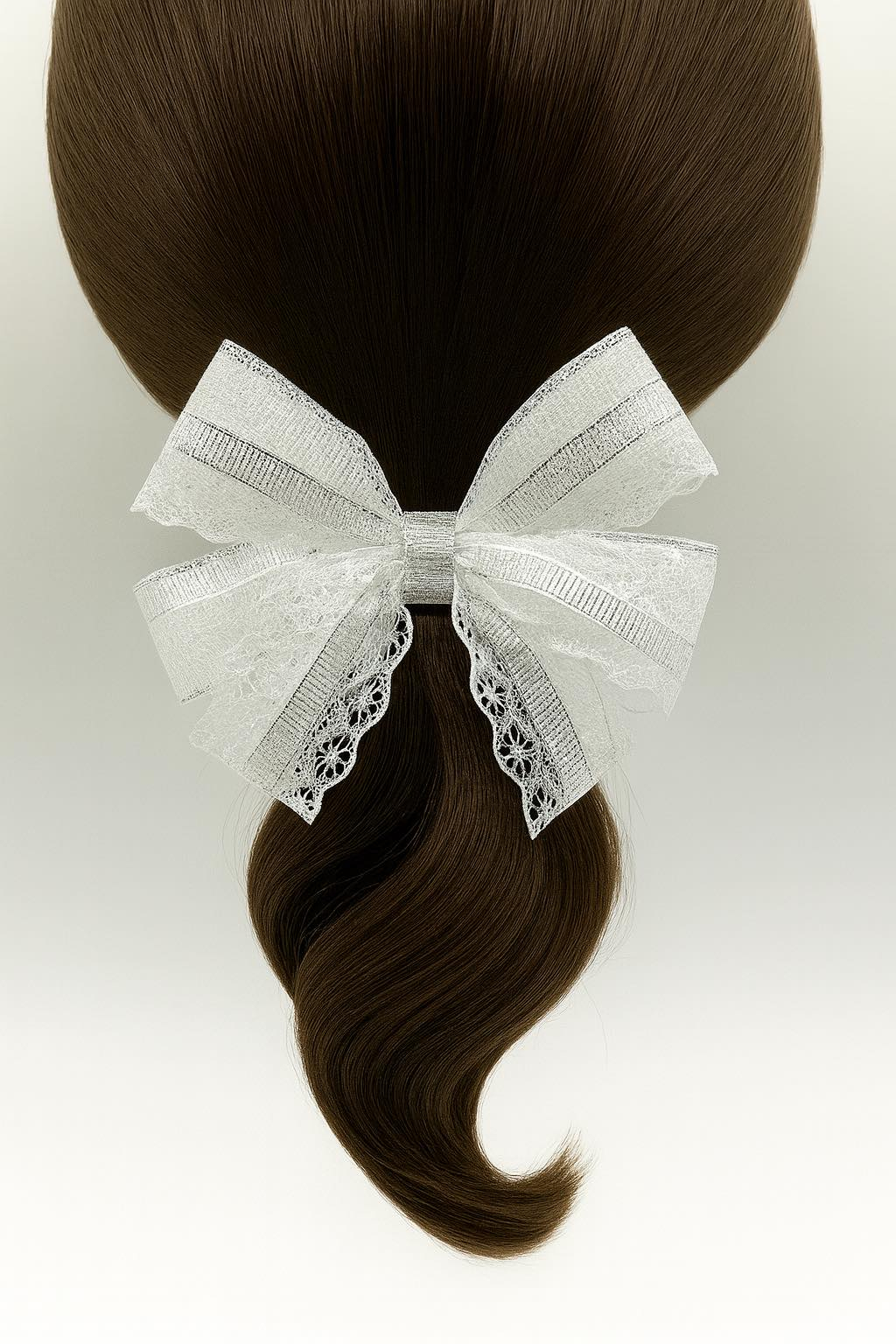 Fundă albă din dantelă pentru păr cu panglici argintii – accesoriu elegant și rafinat pentru fete și femei. Potrivită pentru școală, baluri de absolvire, nunți, evenimente festive și ședințe foto. Realizată din dantelă delicată și panglică strălucitoare, fixată sigur pe elastic, își păstrează forma și este potrivită pentru orice tip de păr. Completează perfect atât ținutele zilnice, cât și pe cele de sărbătoare.