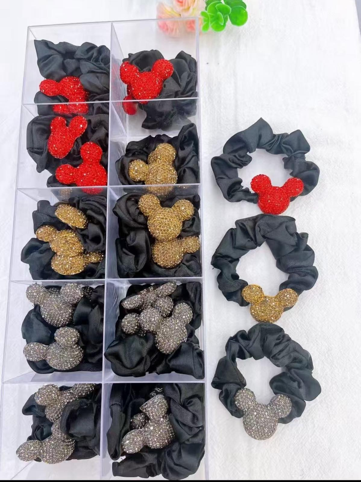 Aceste elastice din material negru moale, decorate cu o figurină strălucitoare în formă de cap Mickey Mouse, sunt ideale pentru fetițe și adolescente care adoră stilul vesel și sclipitor. Accesoriul oferă un plus de culoare și personalitate coafurii tale.