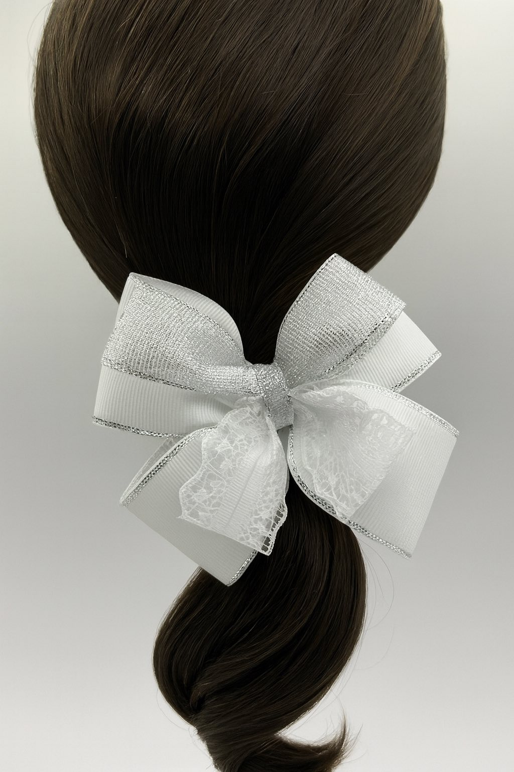Fundă albă pentru păr cu margine argintie și dantelă – accesoriu elegant pentru fete și femei. Potrivită pentru școală, sărbători, nunți și ședințe foto. Realizată din panglică groasă tip grosgrain, decorată cu element argintiu strălucitor și inserții de dantelă. Se prinde sigur pe elastic, potrivită pentru păr des și subțire.