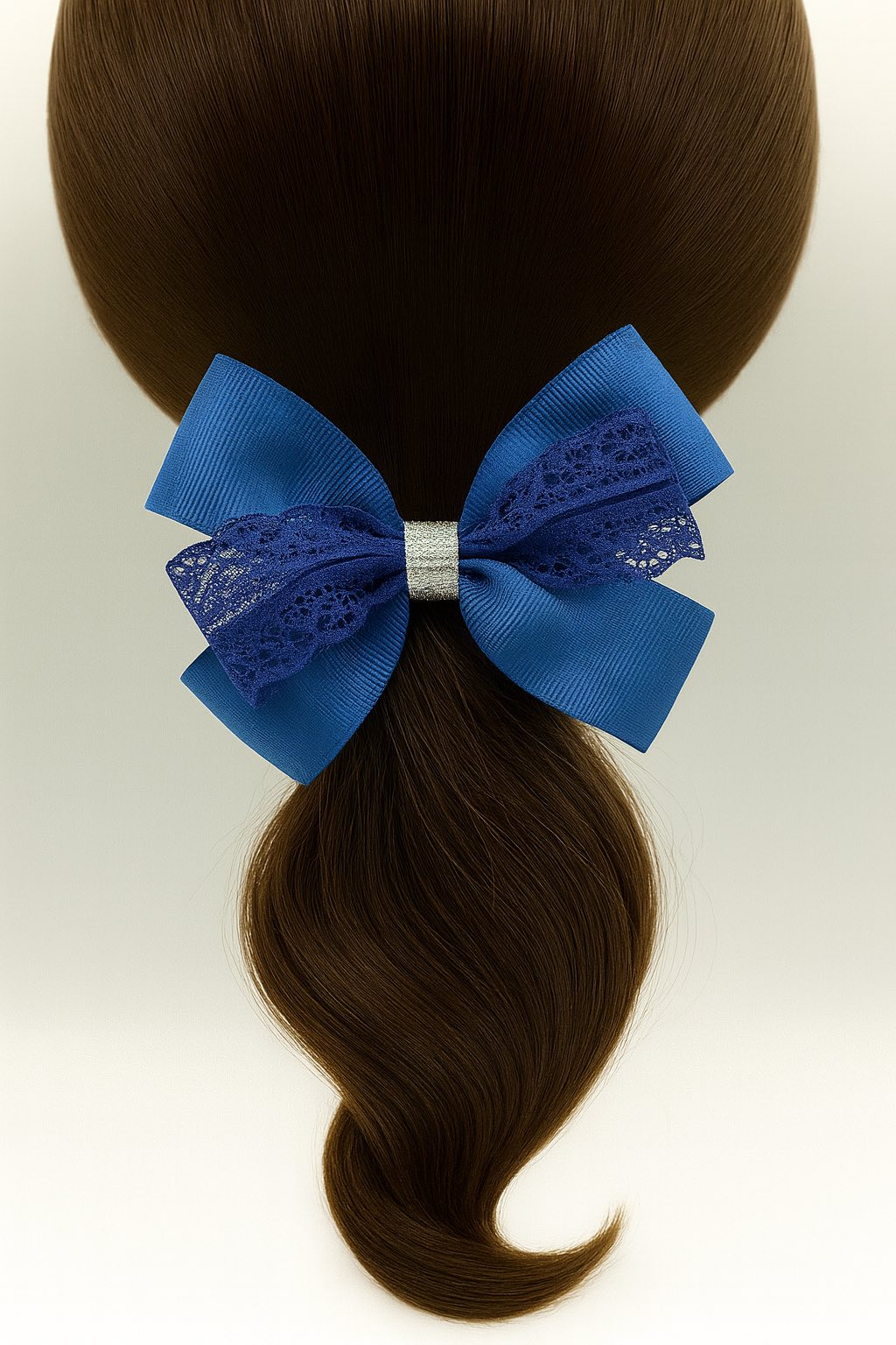 Fundă albastră din dantelă pentru păr cu centru argintiu – accesoriu elegant și rafinat pentru fete și femei. Potrivită pentru școală, evenimente festive, nunți și ședințe foto. Realizată din dantelă fină cu margini lucrate cu atenție, fixată sigur pe elastic, ideală pentru orice tip de păr. Completează perfect atât coafurile de sărbătoare, cât și cele de zi cu zi.
