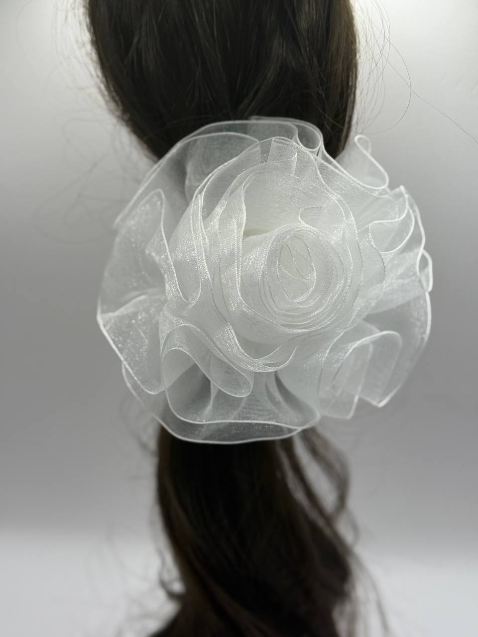 Elastic alb pentru păr în formă de floare trandafir din organza — un accesoriu rafinat pentru fete și femei. Ușor, aerat și voluminos, este perfect pentru școală, bal, nuntă, serbare sau orice eveniment festiv. Baza elastică fixează părul în siguranță, fără a-l deteriora, păstrând coafura impecabilă întreaga zi.