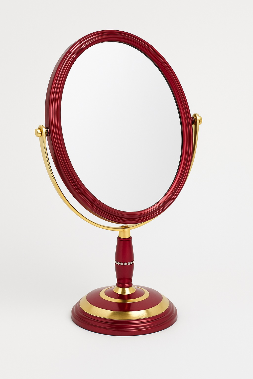 Această oglindă rotundă de masă, în nuanțe elegante de bordo și auriu, adaugă un plus de rafinament oricărei mese de toaletă. Designul rotativ permite reglarea unghiului după preferințe. Detaliile cu pietricele decorative oferă un farmec retro aparte. Perfectă pentru machiaj, îngrijire personală sau ca un cadou deosebit.