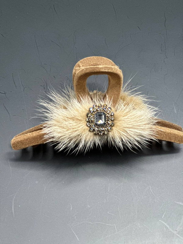 Роскошный крабик для волос с бархатным покрытием, пушистым декором из искусственного меха и сверкающим украшением из страз. Подчёркивает женственность и изысканность, идеально подойдёт для вечерних образов или особых случаев.