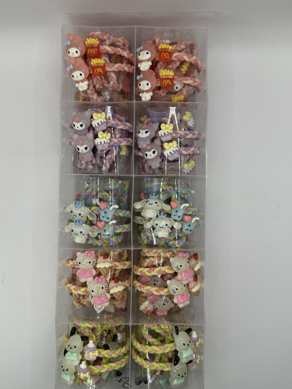 Яркая плетёная резинка в персиково-розовых тонах, украшена фигуркой любимого персонажа My Melody и весёлой миниатюрой картошки фри.