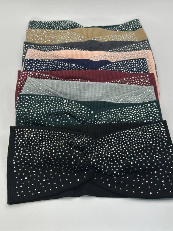 Эти модные повязки на голову украшены множеством блестящих страз, которые красиво переливаются при свете. Модель выполнена из эластичного трикотажа в рубчик с удобной посадкой и перекрутом спереди. Подходит для повседневного ношения, прогулок, фотосессий, вечеринок и как эффектный аксессуар.