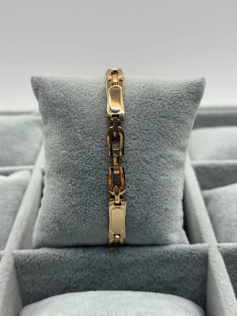 Элегантный браслет с крупными звеньями и продуманным дизайном. Лаконичная форма и блестящая поверхность придают аксессуару современный вид. Прочный и удобный, он идеально подходит для повседневного ношения, а также гармонично дополняет деловой или праздничный образ.