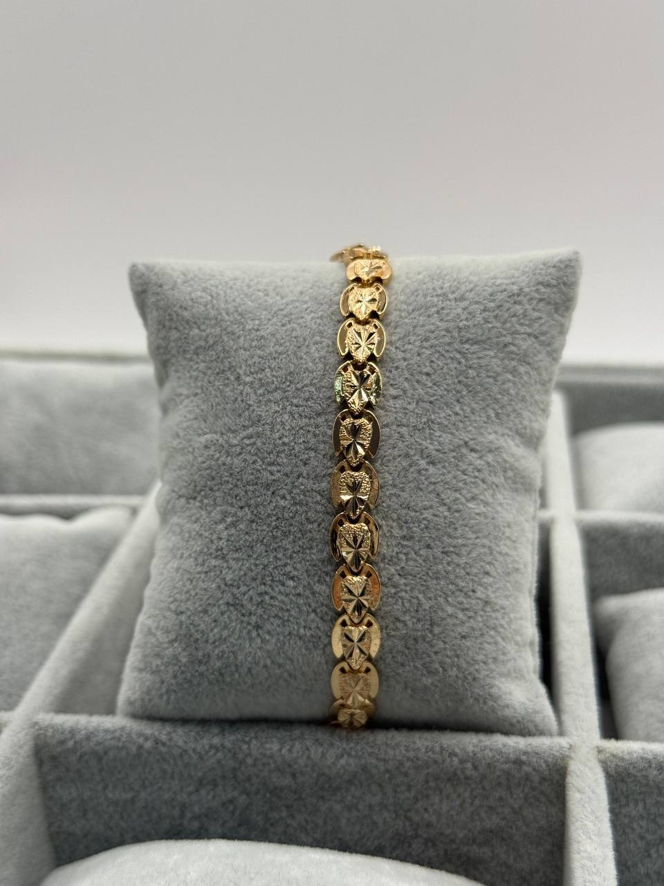 Изысканный браслет с декоративными элементами в виде овальных звеньев с рельефным узором. Лёгкий и удобный, он станет универсальным аксессуаром для повседневного ношения и праздничных выходов. Его дизайн гармонично сочетается с другими украшениями, подчёркивая женственность и утончённый вкус.