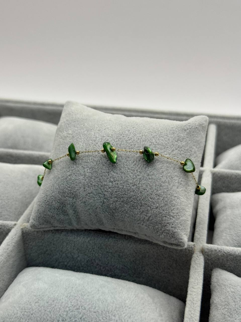 Элегантный браслет с зелёными натуральными камнями и золотистыми акцентами — идеальный аксессуар для утончённого стиля. Тонкая цепочка с мелкими золотистыми бусинами удерживает аккуратно ограненные камни насыщенного зелёного оттенка — природная красота и лёгкость в одном изделии. Отлично подходит для повседневного ношения, добавит утончённости сдержанному образу и станет гармоничным дополнением к вечернему наряду.
