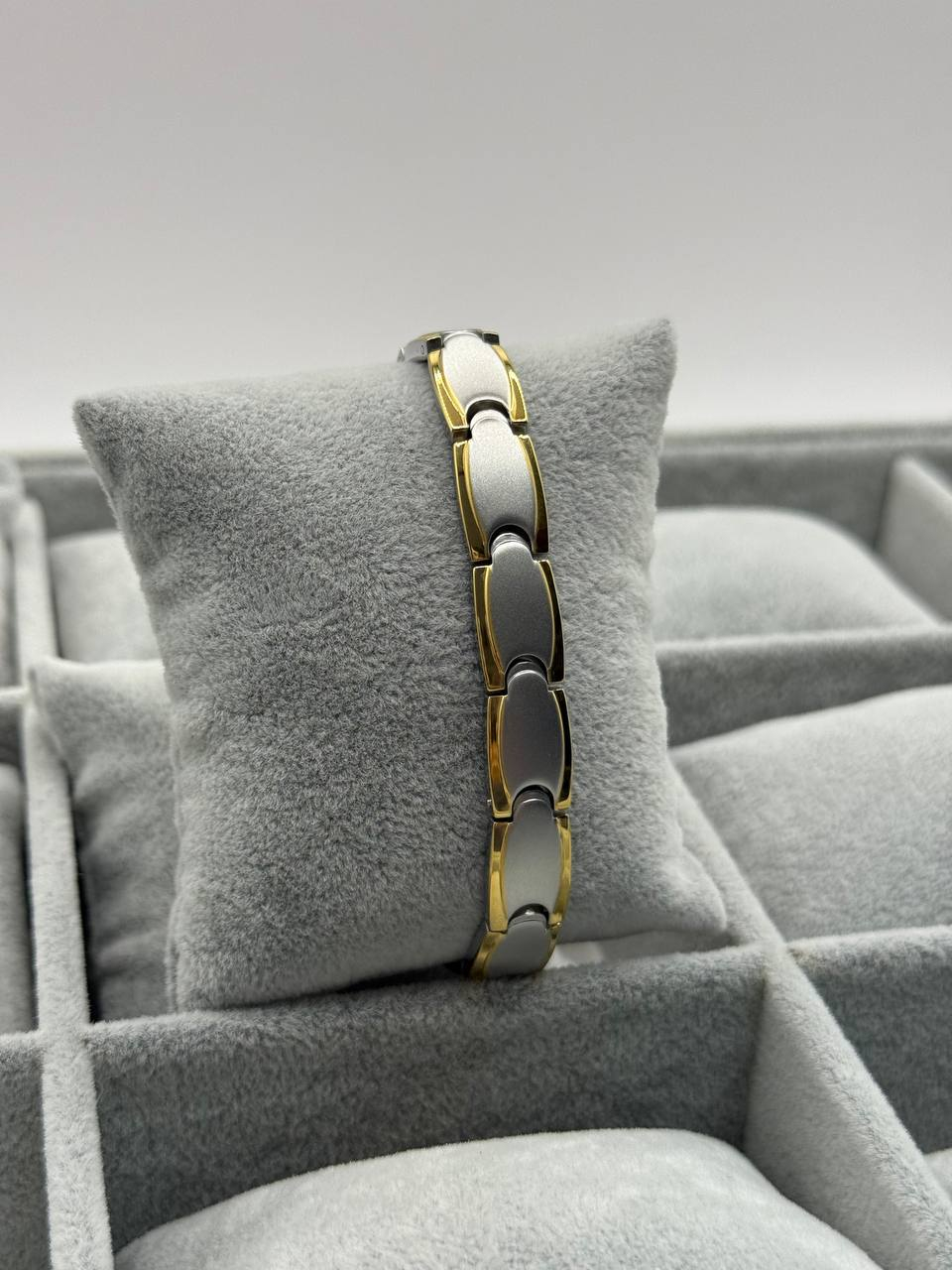 Элегантный двухцветный браслет из нержавеющей стали — стильный аксессуар для мужчин и женщин. Совмещение матового серебристого и золотистого оттенка придаёт браслету современный и универсальный вид, подходящий как для повседневного образа, так и для особых случаев.