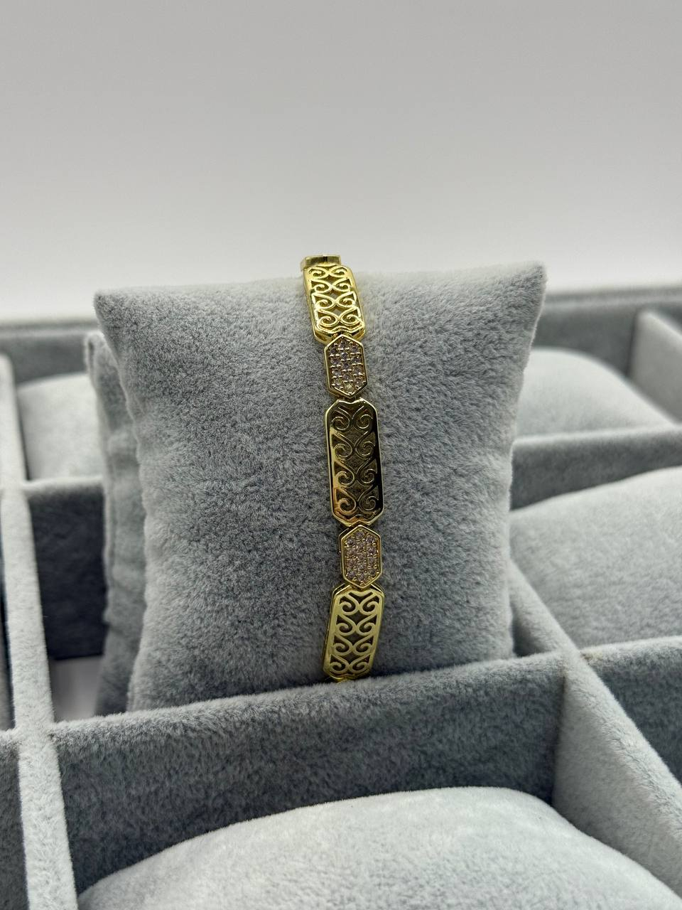 Изящный женский браслет золотистого цвета с декоративным узором и вставками из сияющих камней. Уникальное сочетание геометрических элементов и ажурных деталей делает браслет стильным и утончённым украшением. Подходит как для повседневного ношения, так и для особых случаев.