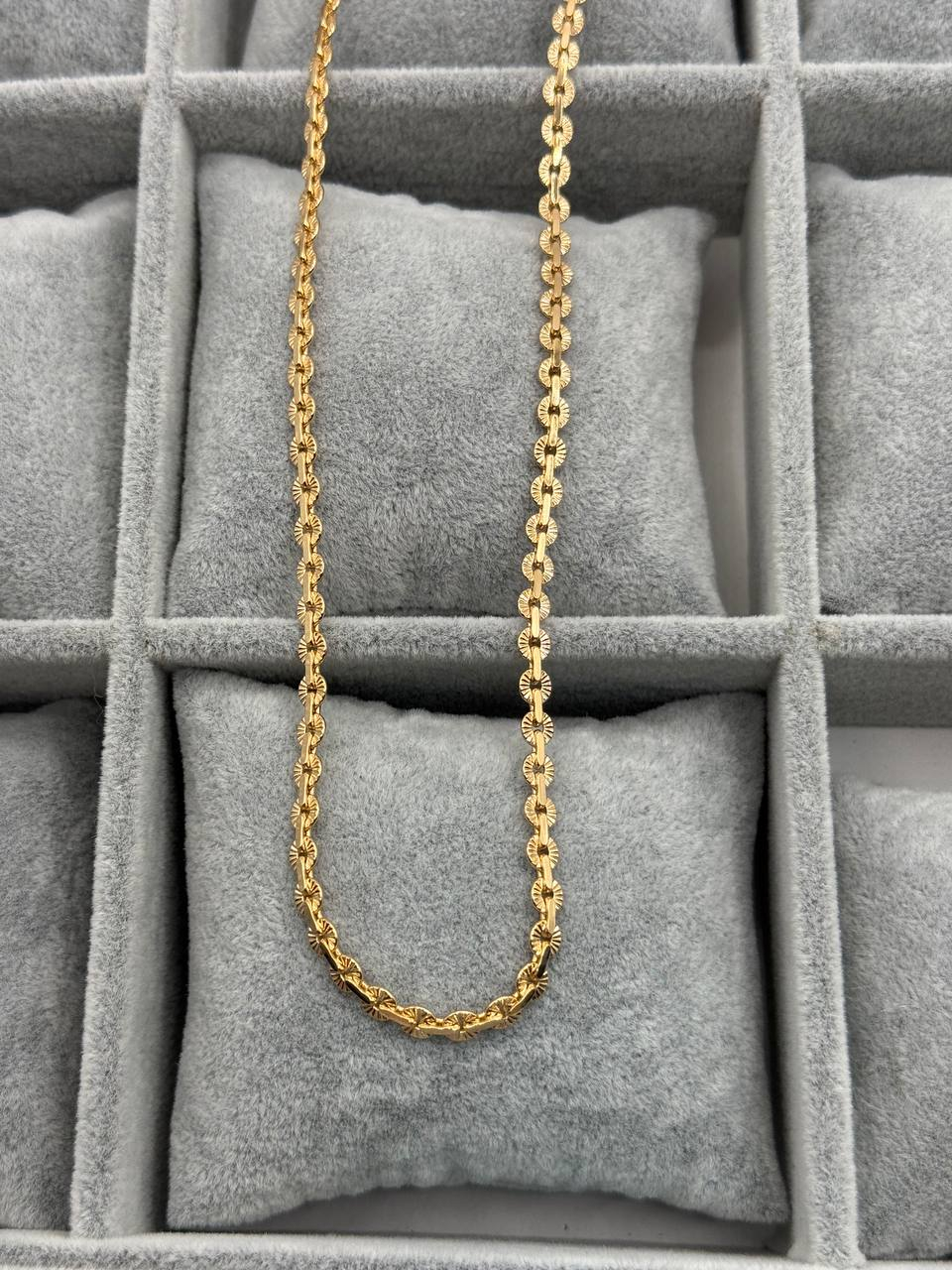 Женская цепочка из ювелирной бижутерии высокого качества. Изготовлена в золотом покрытии, не темнеет и долго сохраняет блеск. Оригинальное плетение в виде листочков делает украшение стильным и необычным. Такая цепочка отлично смотрится как самостоятельный аксессуар или в сочетании с подвеской. Подходит для повседневной носки и для праздничных образов. Идеальный подарок для девушки или женщины.