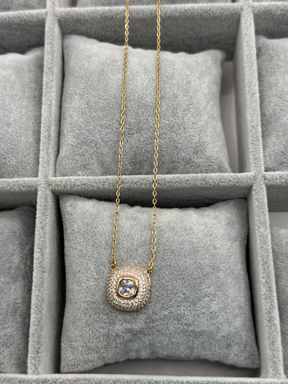 Элегантное женское колье с подвеской в виде квадрата с крупным камнем в центре и инкрустацией мелких фианитов по контуру. Изготовлено из качественной бижутерии с золотым покрытием, не темнеет и сохраняет блеск при носке. Стильный дизайн делает украшение универсальным – оно подходит как для повседневных образов, так и для торжественных случаев. Отличный подарок для девушки или женщины, который подчеркнёт её изящество и вкус