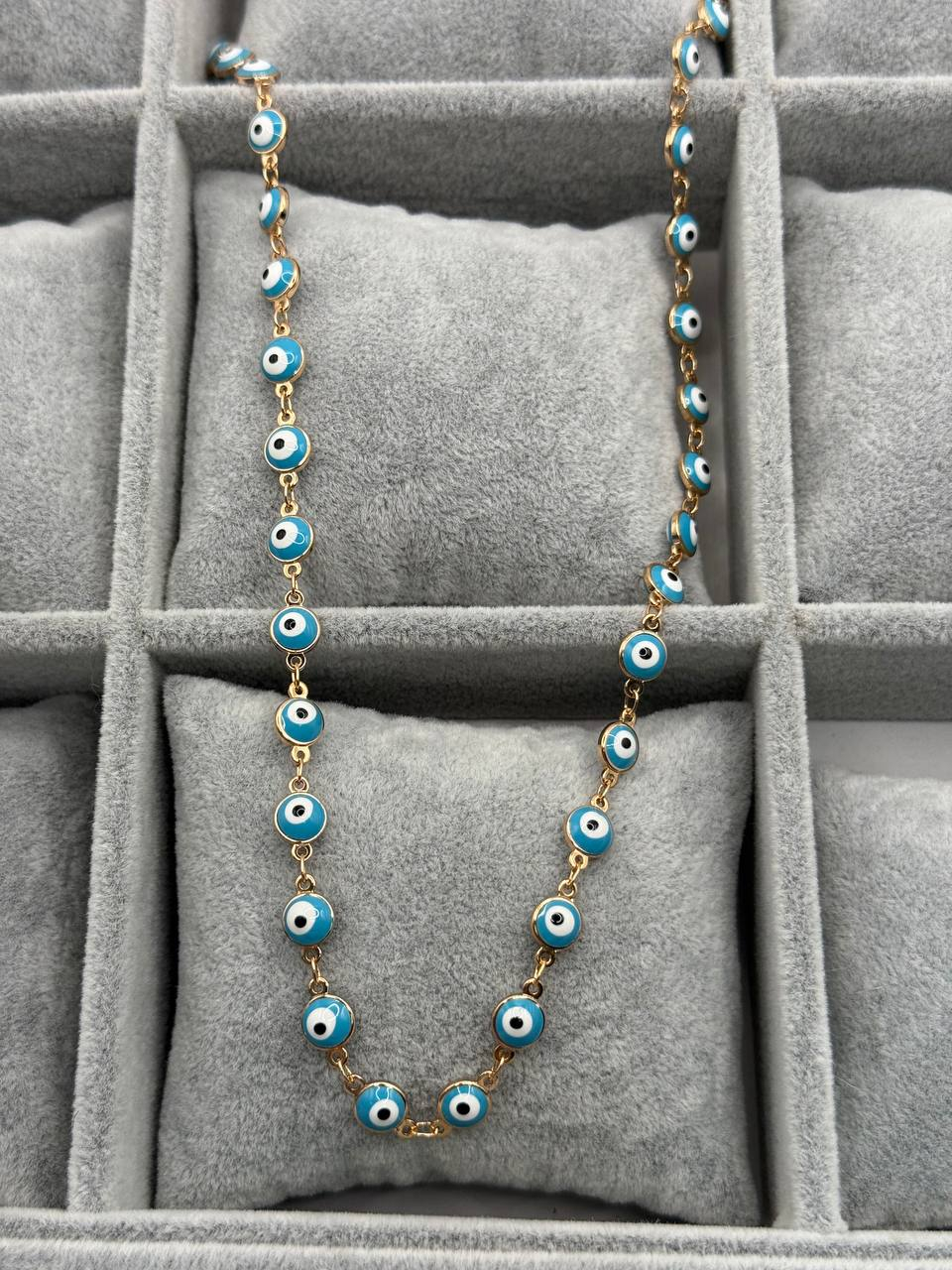 Женское колье-оберег с голубыми глазками «назар». Каждая вставка выполнена в форме глазика, который символизирует защиту от сглаза и негативной энергии. Украшение изготовлено из качественной бижутерии с золотым покрытием, не темнеет и сохраняет блеск. Яркий и стильный аксессуар, который гармонично дополняет повседневный образ и придаёт ему особый шарм. Отличный выбор для подарка девушке или женщине