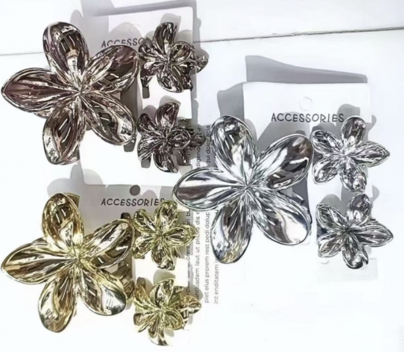 Эффектные крабики для волос в виде объемных цветов с блестящим металлическим покрытием. Подходят как для повседневного ношения, так и для торжественных случаев. Прочно фиксируют волосы, не скользят и добавляют элегантности любому образу.