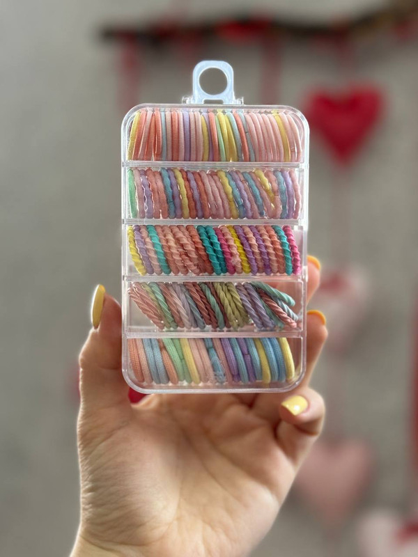 Красочный набор резинок для волос в удобной прозрачной коробке. Включает разные виды резинок: гладкие, витые и тканевые, в нежной пастельной гамме.