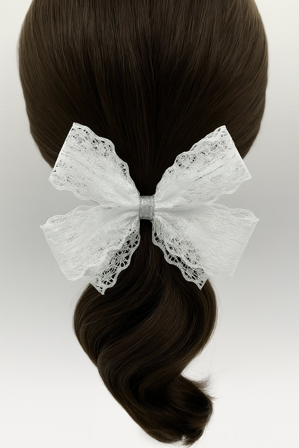 Белый кружевной бант для волос с серебристым центром — нежный и элегантный аксессуар для девочек и женщин. Подходит для школы, праздников, свадеб и фотосессий. Выполнен из ажурного кружева с аккуратной отделкой, легко фиксируется на резинке, подходит как для густых, так и для тонких волос. Идеальный выбор для праздничного образа или повседневной причёски.