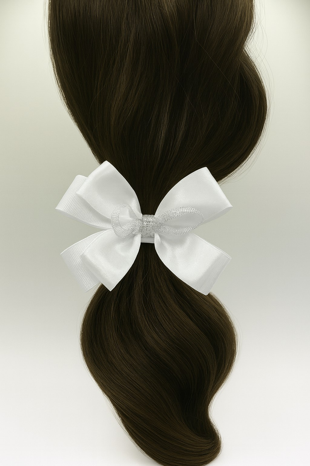 Белый бантик для волос с атласной текстурой и серебристым центром — стильный и универсальный аксессуар. Идеален для школы, праздников, свадеб и фотосессий. Он легко закрепляется на резинке и бережно держит волосы. Благодаря гладкости атласа и изящной форме, бантик добавляет образу элегантность и шарм.