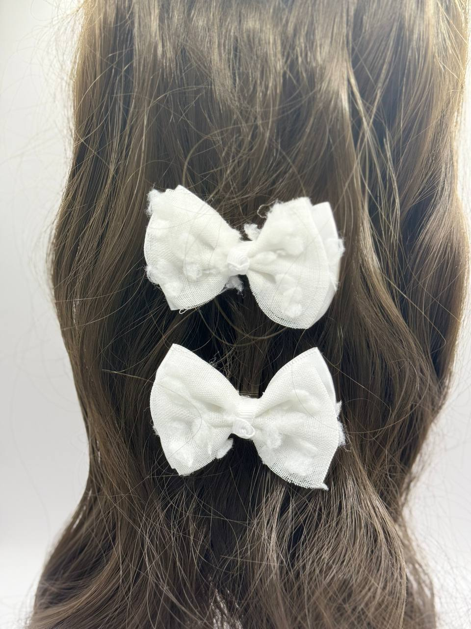 Заколки для волос с белыми бантиками из ткани — нежный и универсальный аксессуар для девочек и девушек. Идеально подойдут для школы, выпускного, утренников, свадеб и других торжеств. Лёгкая тканевая основа и изящный бант создают воздушный и аккуратный образ, а надёжный зажим обеспечивает удобную фиксацию волос без повреждений. Подходит для повседневных причёсок и особых случаев.