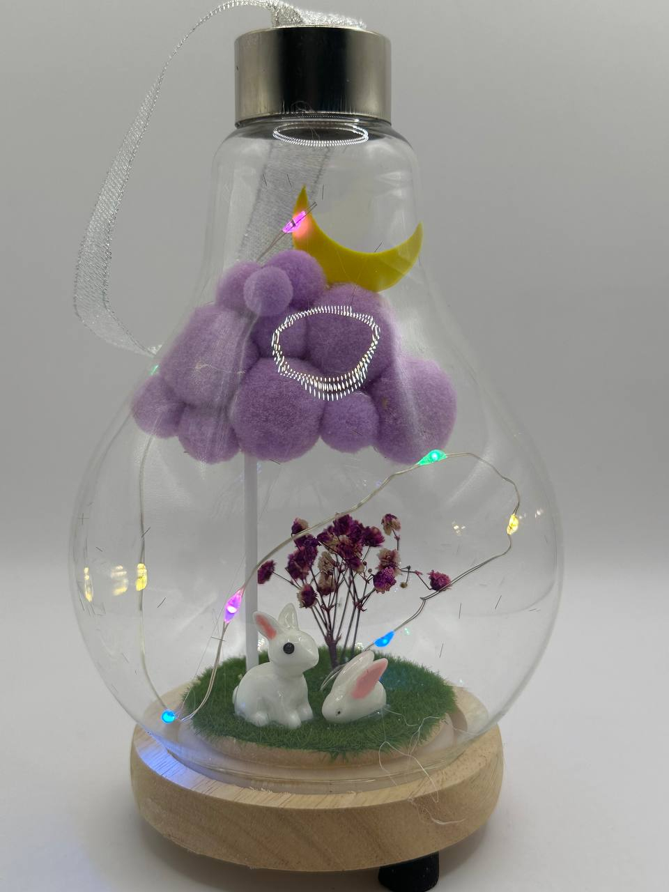 Lumină decorativă cu flamingo în bulb – atmosferă magică în orice cameră Transformă orice colț al casei într-un spațiu de poveste cu această lampă deosebită în formă de bec. În interior se ascunde un peisaj fermecător: un flamingo roz sub un copac pufos roșu, înconjurat de flori uscate și o lună galbenă, toate învăluite de luminițe LED multicolore. ✨ Detalii produs: • Formă: bec decorativ cu suport din lemn • Elemente 3D: flamingo, copac din pompoane, flori uscate, lună galbenă • Lumină LED colorată integrată • Bază din lemn natural, cu piciorușe antiderapante • Ideală pentru dormitor, birou, cadou romantic sau decor de sezon 🌈 Creează o atmosferă caldă, relaxantă și jucăușă!